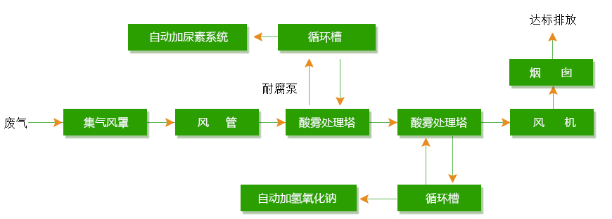(酸霧廢氣)采用兩套凈化塔串聯(lián)進(jìn)行吸收處理,吸收劑采用尿素和氫氧化鈉進(jìn)行中和處理,其治理工藝流程如下: